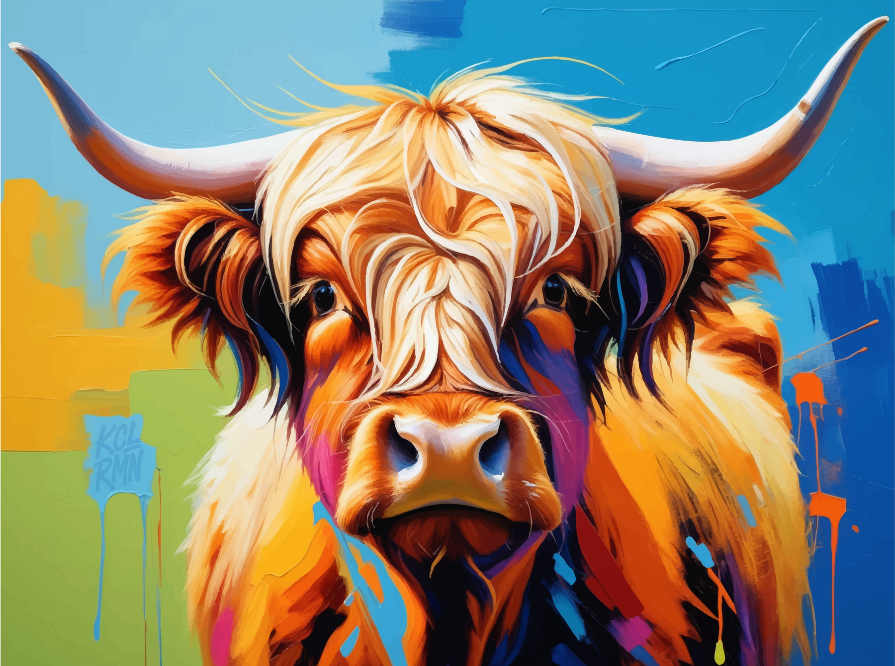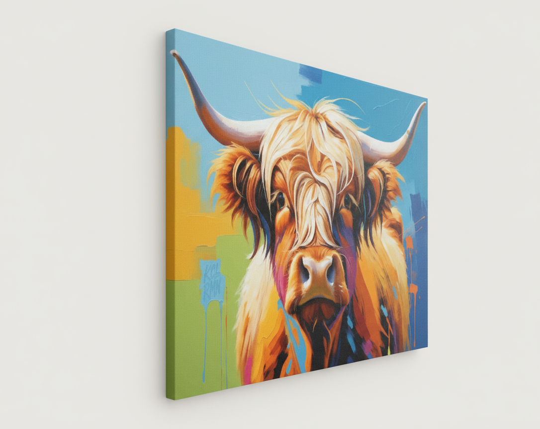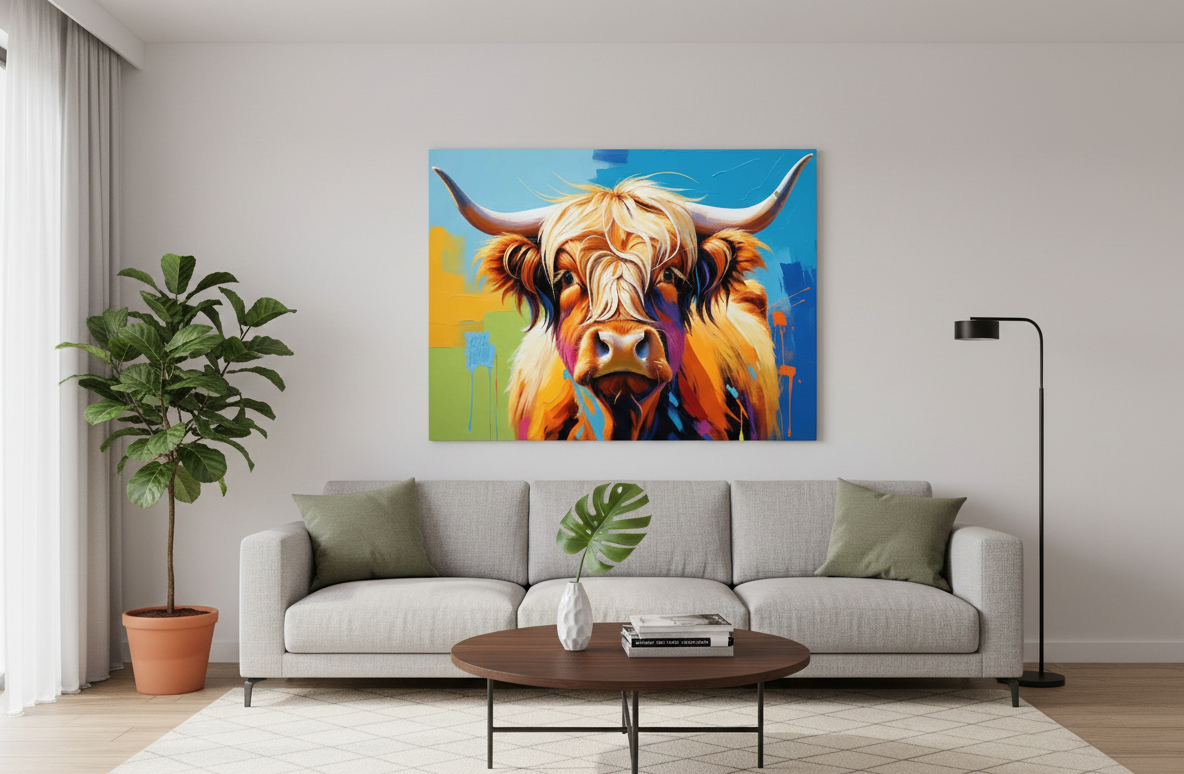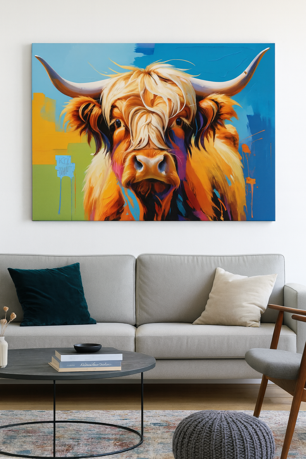Highland Cow op Canvas – Kleurrijk Statement door KCLRMN 120x90cm (Limited Edition, 150 stuks)
